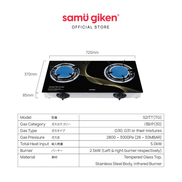 Total Heat Input: 5kW (2.5kW left & right burner respectively)