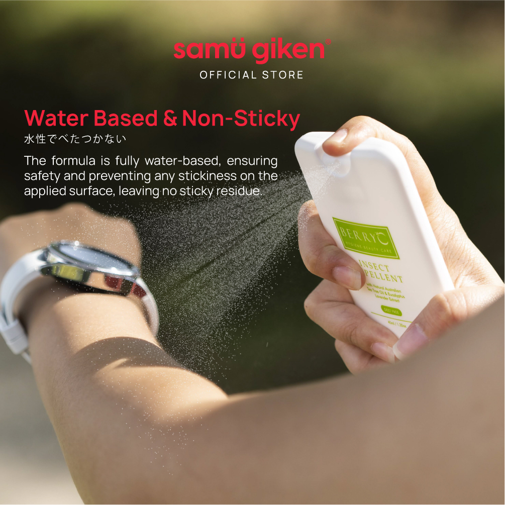 The formula is complete water-based, it is safe and will not cause stickiness issues on the applied surface. you won’t feel any stickiness after using BerryC Insect Repellent.